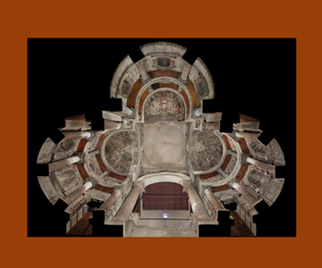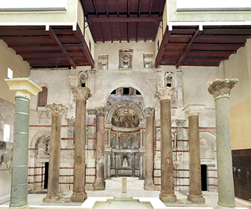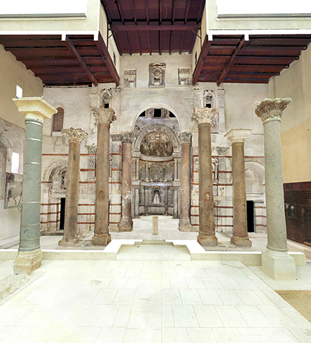 In this church, late antique paintings cover about eighty percent of the walls, niches, columns, pilasters, pediments and apses.